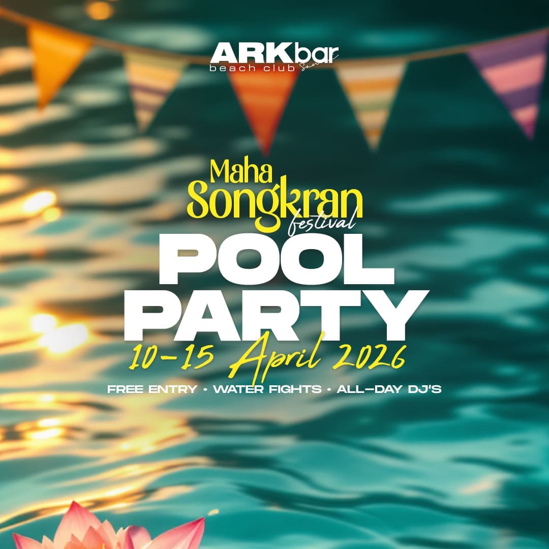 The Maha Songkran Festival Pool Party is in full flow at ARKbar Beach Club on Chaweng Beach, Koh Samui on Sunday 12 April 2026. Two beachfront pools, all-day DJs, water fights, and free entry — this is what the best Songkran pool party in Koh Samui looks like. ARKbar Beach Club is the place to be this Songkran, and today is another full day of sun, music, and water on Chaweng Beach.